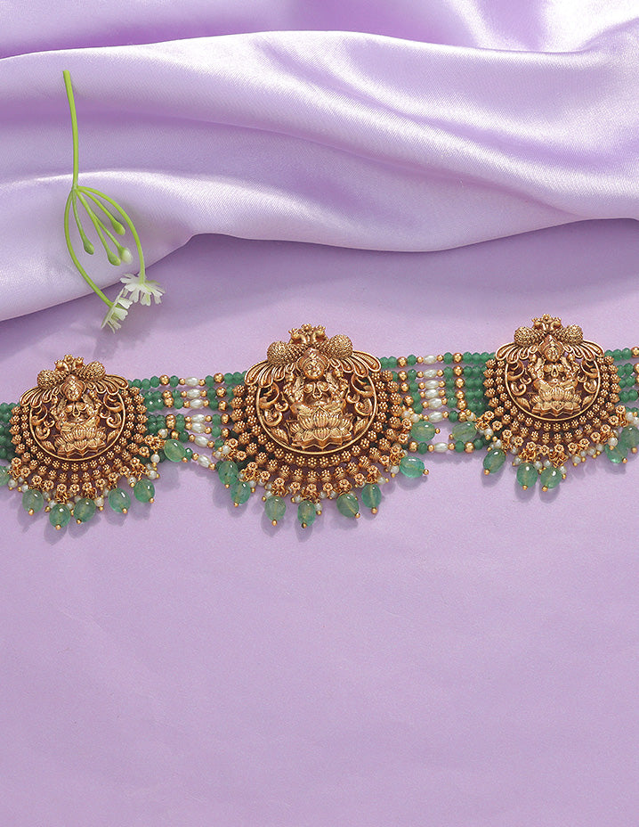The Designer Matt Lakshmi Devi Beads Chain Vaddanam appeals to customers who value intricate zirconia detailing and traditional elegance. It meets the demand for ornate, culturally significant jewelry with a modern designer finish.
