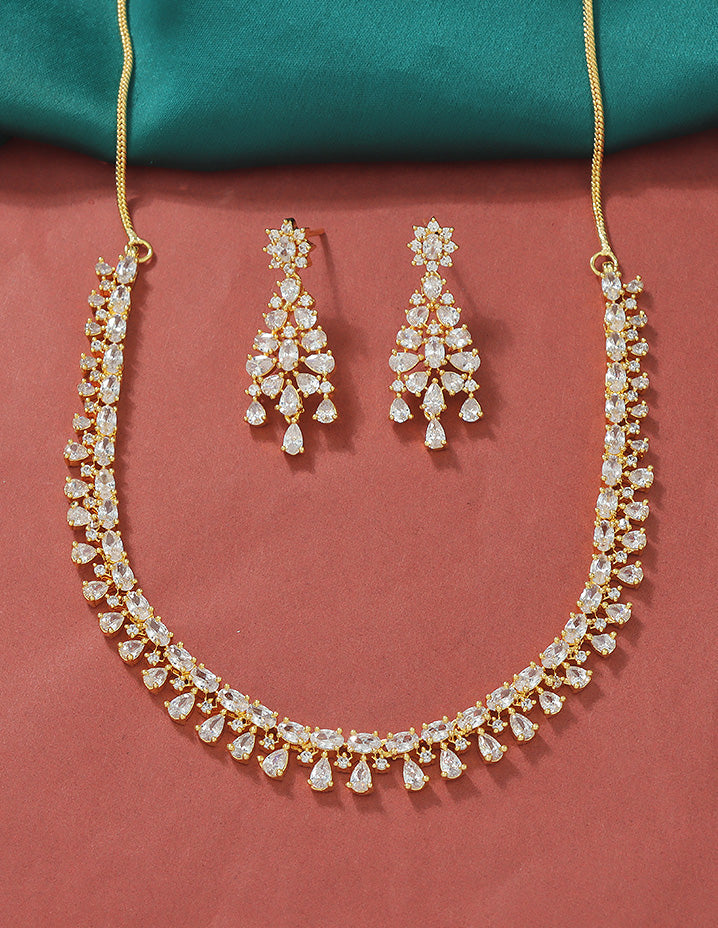 Elevate your style with this Designer Zirconia Elegance Necklace Set, featuring radiant white stones and a refined gold polish for timeless sophistication. Perfectly crafted to add a luxurious touch to any ensemble.
