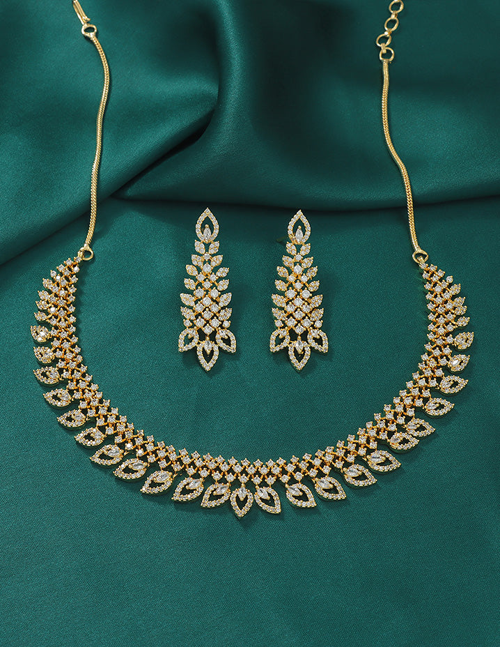 Elevate your style with this Designer Zirconia Elegance Necklace Set, featuring radiant white stones and a refined gold polish for timeless sophistication. Perfectly crafted to add a luxurious touch to any ensemble.