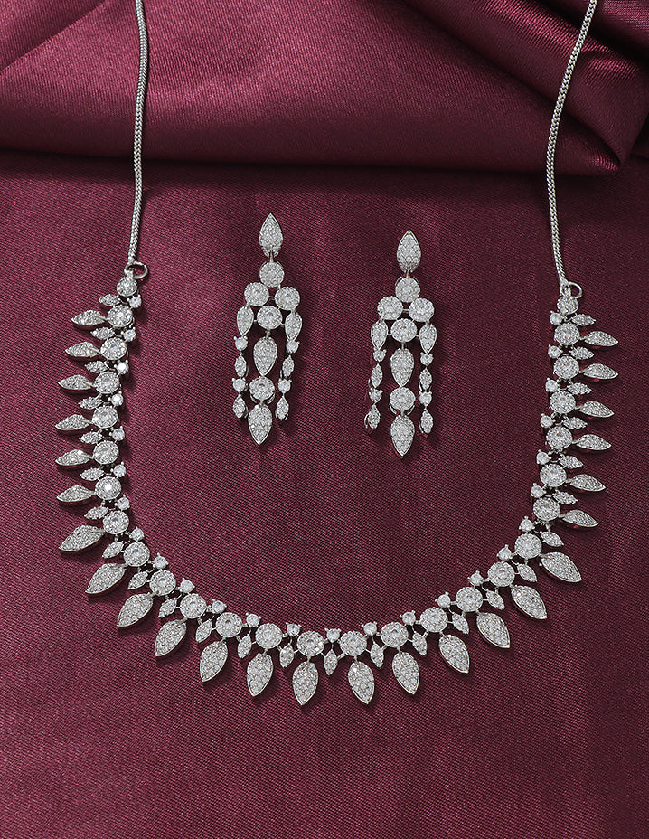 This Designer Zirconia Elegance Necklace Set features sparkling white stones enhanced by a durable rhodium polish. Its refined craftsmanship adds a sophisticated glow to any ensemble.