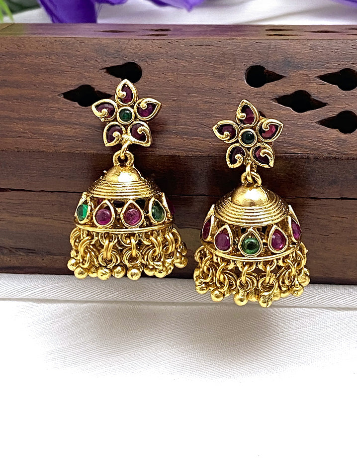 This Antique-plated Kempu Necklace Set, featuring Ruby & Emerald stones, offers a blend of elegance and bold style. Perfect for any traditional occasion, choose from various designs to make a stunning statement with eye-catching desi charm.