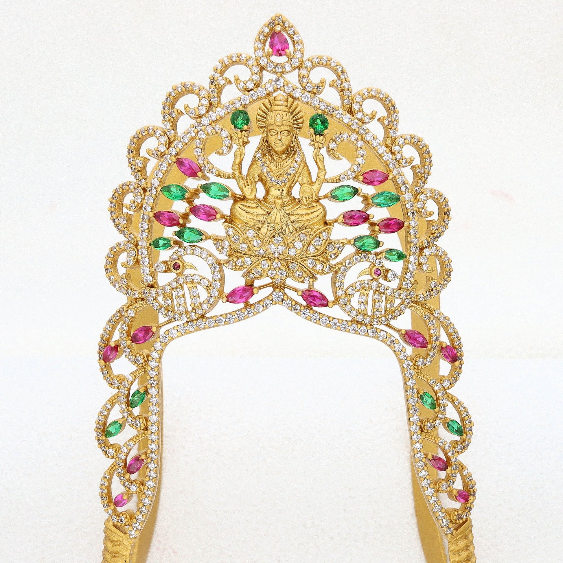 This beautiful Ruby, Emerald & White Gold Plated Lakshmi Devi Vamki is made of the highest quality metalwork and embroidered with dazzling American Diamonds. Best for any season, this traditional Vamki will make you stand out in the crowd any day. Whether its a friends party or a traditional event, this Vamki is perfect for any occasion.