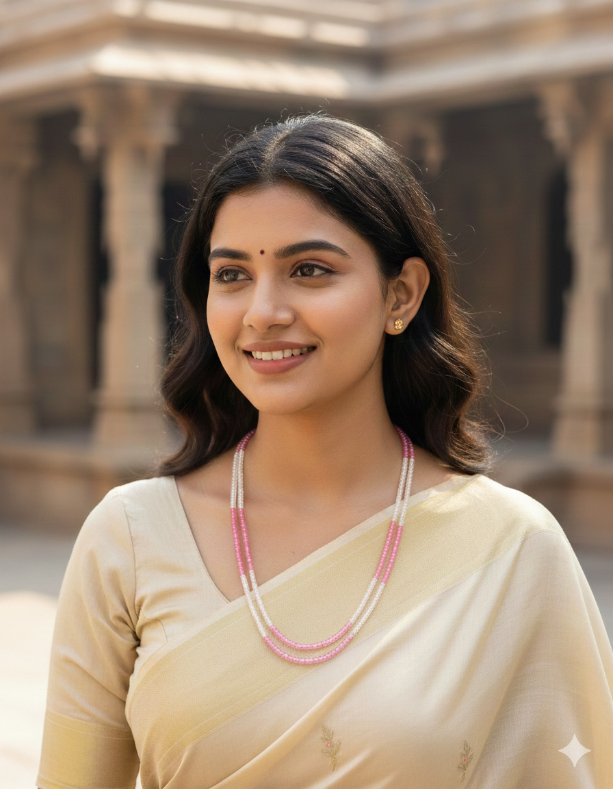 Embrace subtle charm with our 2-Line Beads Mala, featuring Baby Pink & White CZ beads. Delicate, graceful, and perfect for special moments!