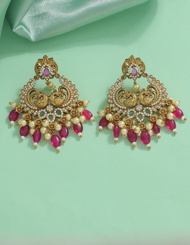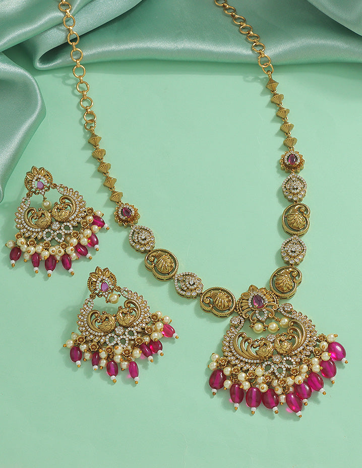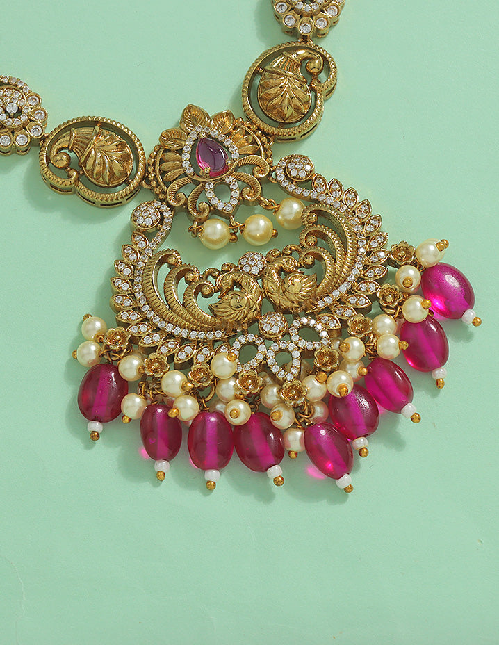This Matt Polish Kempu Necklace Set, studded with dazzling Ruby and CZ stones, radiates elegance and style. Its unique design is a visual treat, making it the perfect statement piece for any occasion.