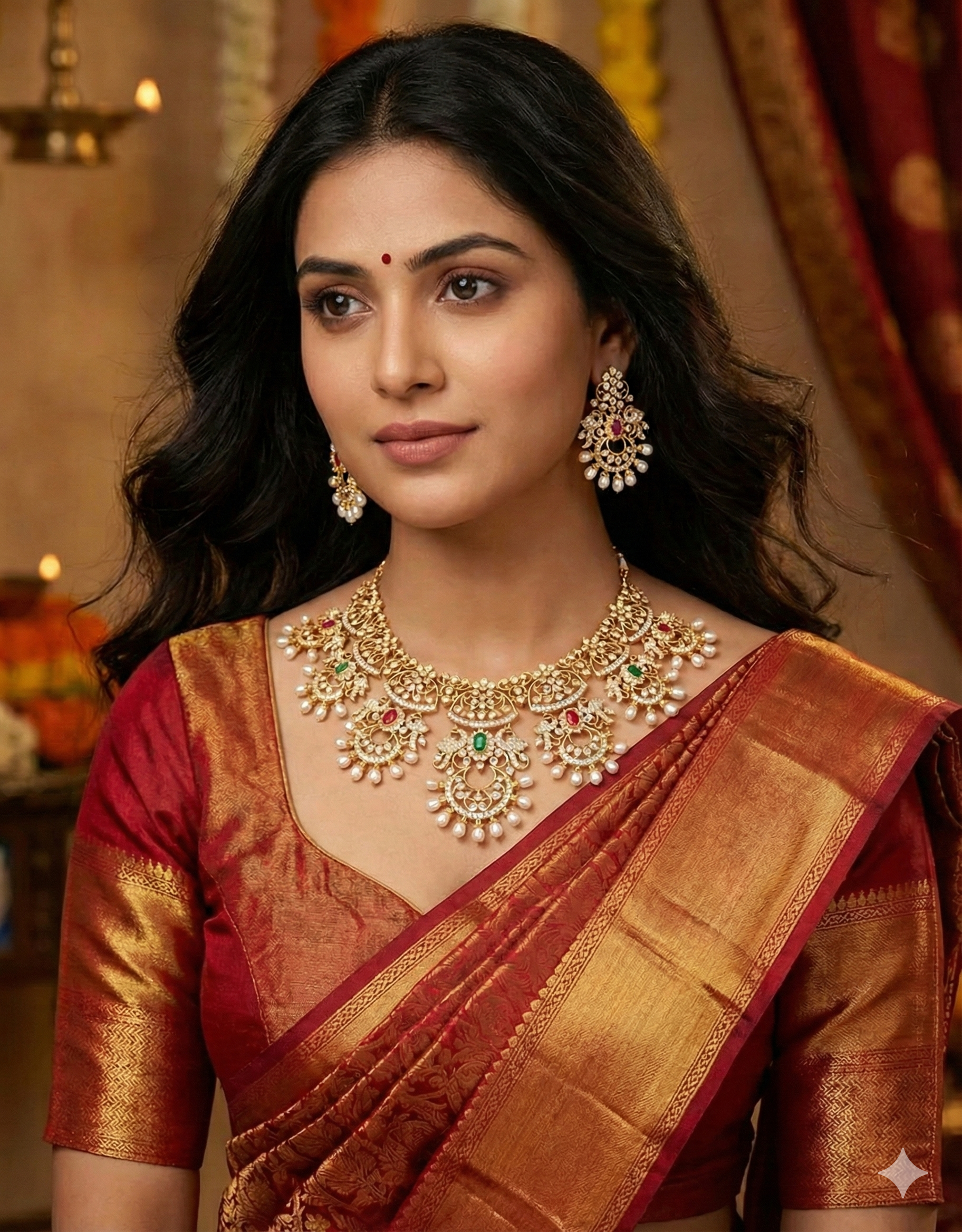 This stunning aesthetic Zirconia necklace set exudes elegance and traditional charm. Studded with American Diamonds, rubies, and emeralds, its classic design radiates a regal flair.