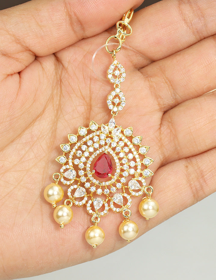 A regal maang tikka featuring a deep red teardrop stone at the center, encircled by layers of sparkling CZ stones in a fan-shaped pattern. Accented with lustrous golden pearl hangings, this piece is ideal for weddings and festive occasions.