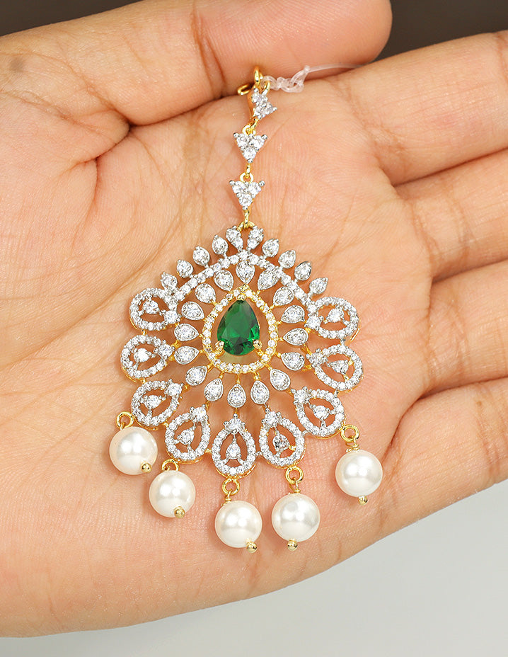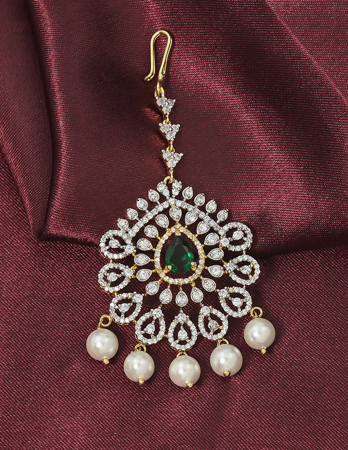 Designer Gold Polish Zirconia Pearl Maang Tikka