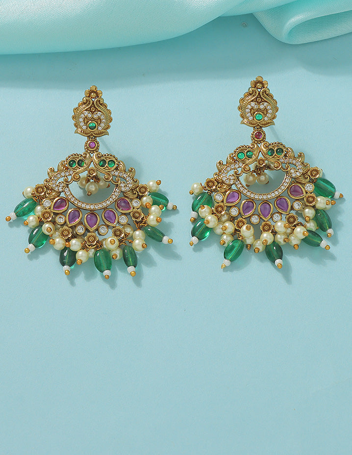 This Matt Polish Kempu Necklace Set, studded with dazzling Emerald and Kempu stones, radiates elegance and style. Its unique design is a visual treat, making it the perfect statement piece for any occasion.