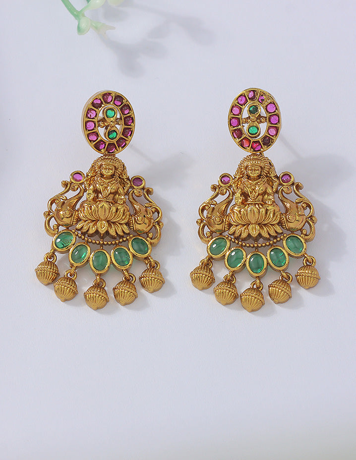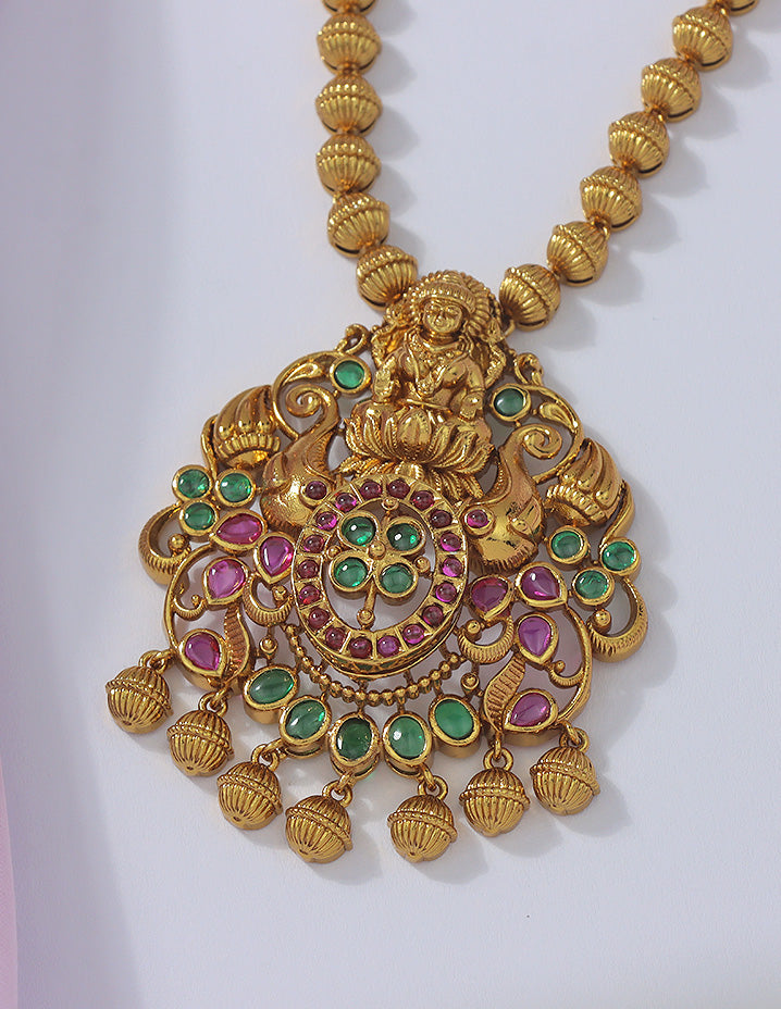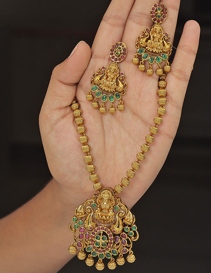 A majestic gold-plated necklace set adorned with vibrant magenta beads, emerald and ruby accents, and intricate temple motifs. The divine Lakshmi design and rich detailing exude traditional charm, perfect for bridal and festive elegance.
