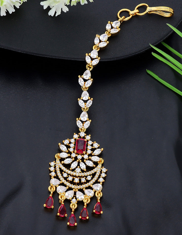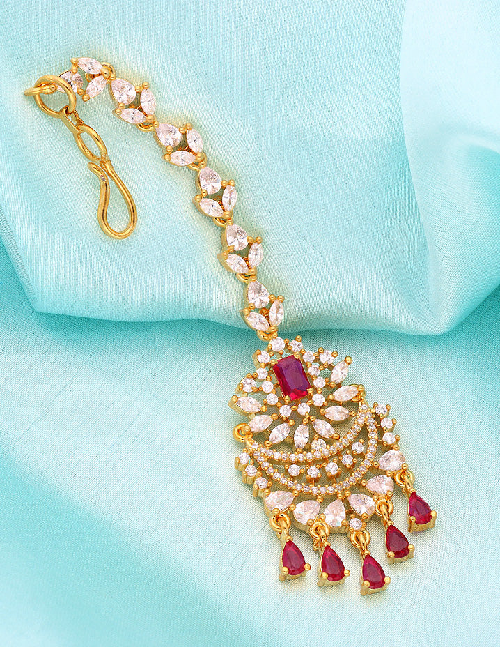Looking for a Maang tikka to match your Gold jewelry? We highly recommend this one. This Cz Maang tikka with colossal pattern, The studded ruby stones and the dangling pearl sit flawlessly with the rest of the design.