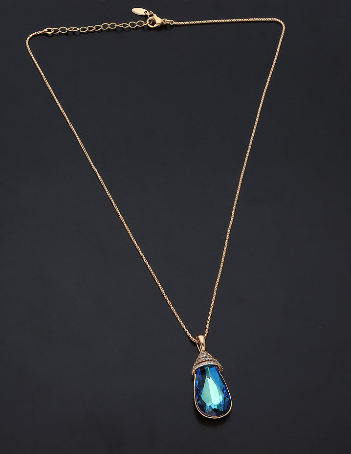 This Swarovski Crystal Aqua Blue Chain Pendant shines with its Blue crystal and elegant Gold polish. Stylish and sophisticated, it adds a touch of luxury to any outfit. A must-have for those who appreciate fine jewelry.