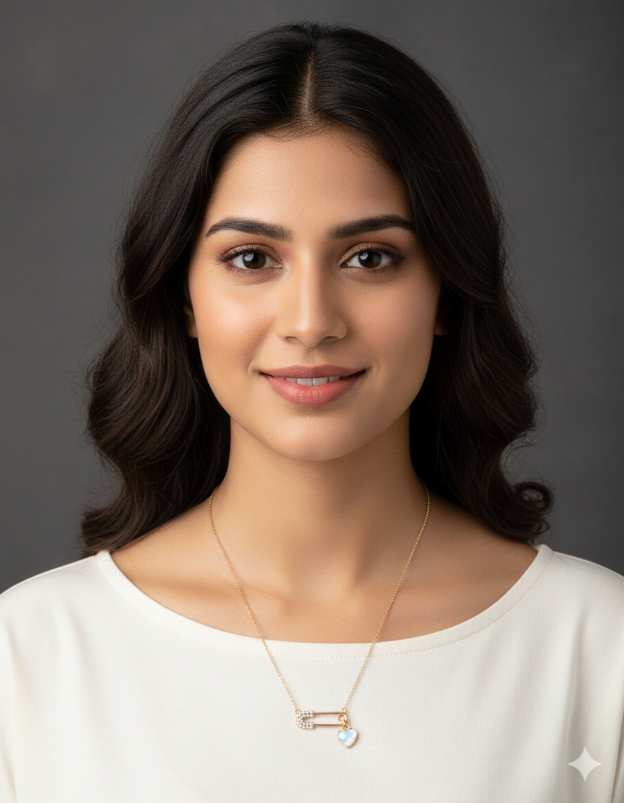 This beautiful designer chain is made of a high-quality tensile alloy that's lightweight and fun. The pendant is a dazzling Swarovski crystal in a safty Pin with beautiful love shape hanging.