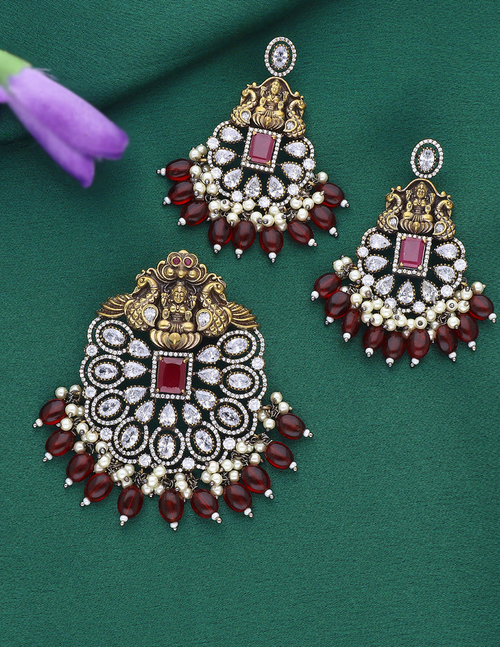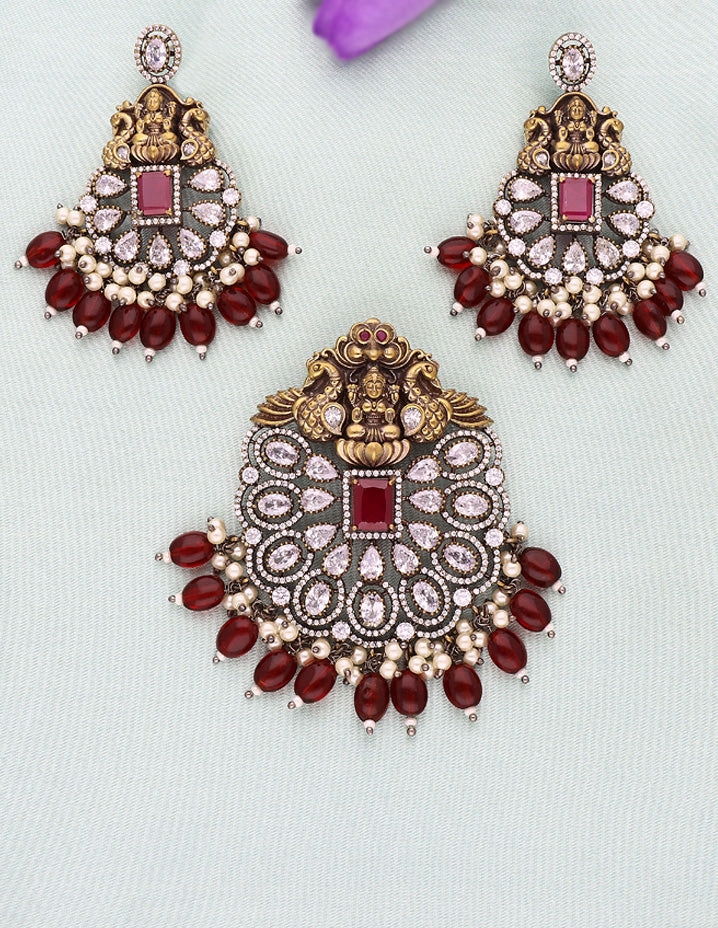 Make a grand impression with our Victorian + Antique Plated CZ Pendant & Earrings Set, adorned with Ruby-White stones, sparkling ADs, and ruby bead drops. A perfect blend of vintage charm and festive elegance!