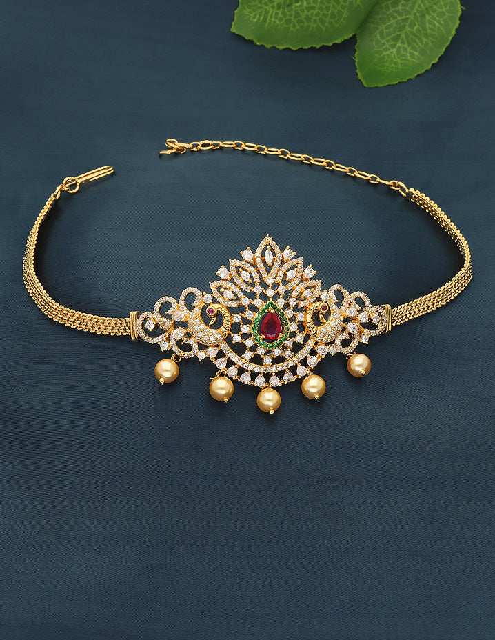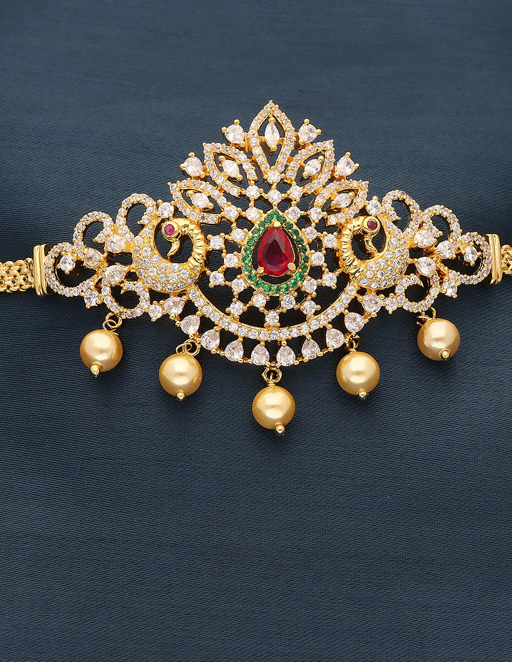 Replace your outdated old Bajuband with this scintillating new CZ Bajuband. You can match it with your favorite saree or lehenga and flaunt your style. The dazzling American diamonds, rubies, and emerald green stones make an amazing blend with the lustrous gold polish and the gorgeous design of Bajuband.