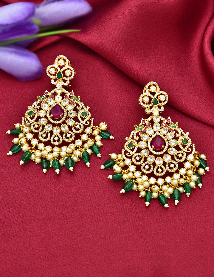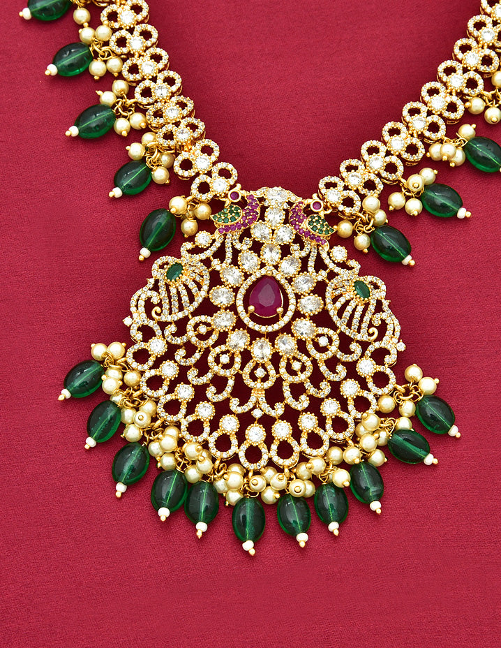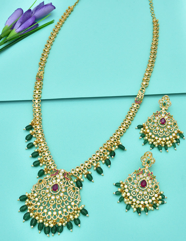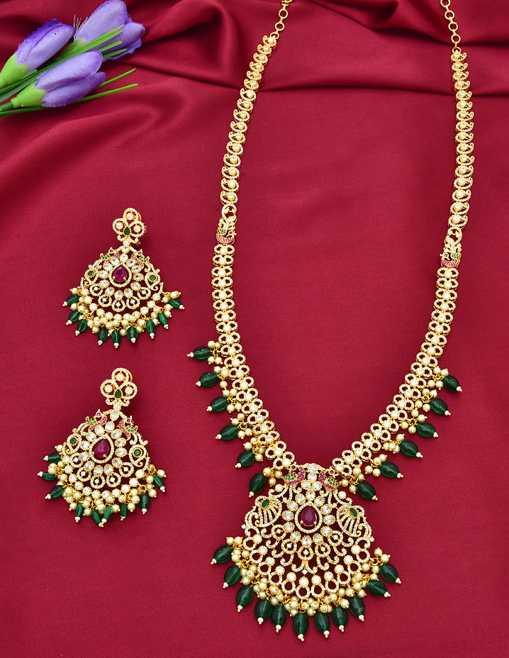 Turn heads in elegance with this majestic CZ Long Haram, crafted with Rubies, Emeralds & sparkling American diamonds. Perfectly paired with your silk saree, the rich gold finish adds a luxurious touch to your festive look.