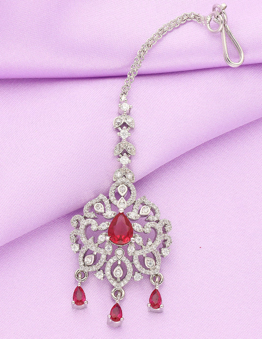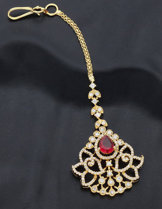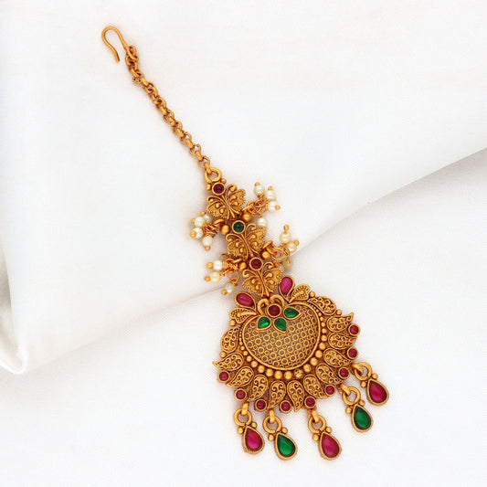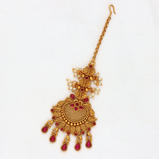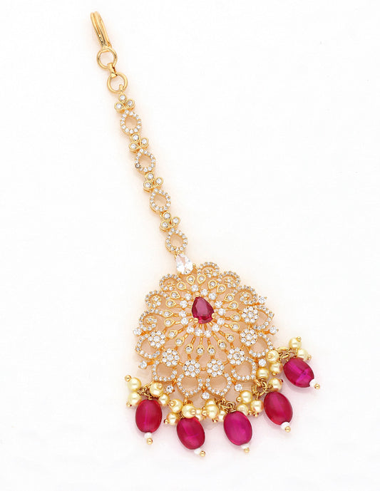 Antique Zirconia Stone Maang Tikka With Ruby Beads