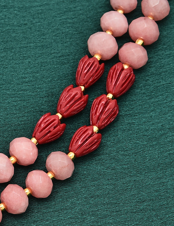 Add a pop of elegance with our Red Tulip & Peach Cut Beads Mala, accented with gold beads and fine metalwork. A perfect blend of vibrant charm and traditional beauty!