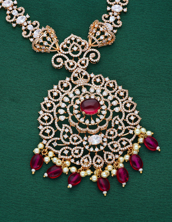 This beautiful Carat-polish CZ necklace set is dripping in elegance and style. Its unique, eccentric design adorned with dazzling American diamond stones is a true feast for the eyes.