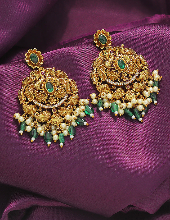This Matt Polish Kempu Necklace Set, studded with dazzling Emerald and Kempu stones, radiates elegance and style. Its unique design is a visual treat, making it the perfect statement piece for any occasion.