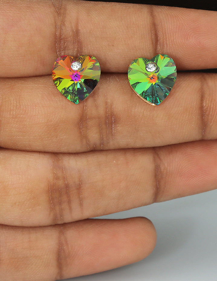 Bursting with color and charm, these dazzling heart-shaped studs feature a radiant rainbow crystal topped with a sparkling stone. A playful pop of joy for every mood and outfit.