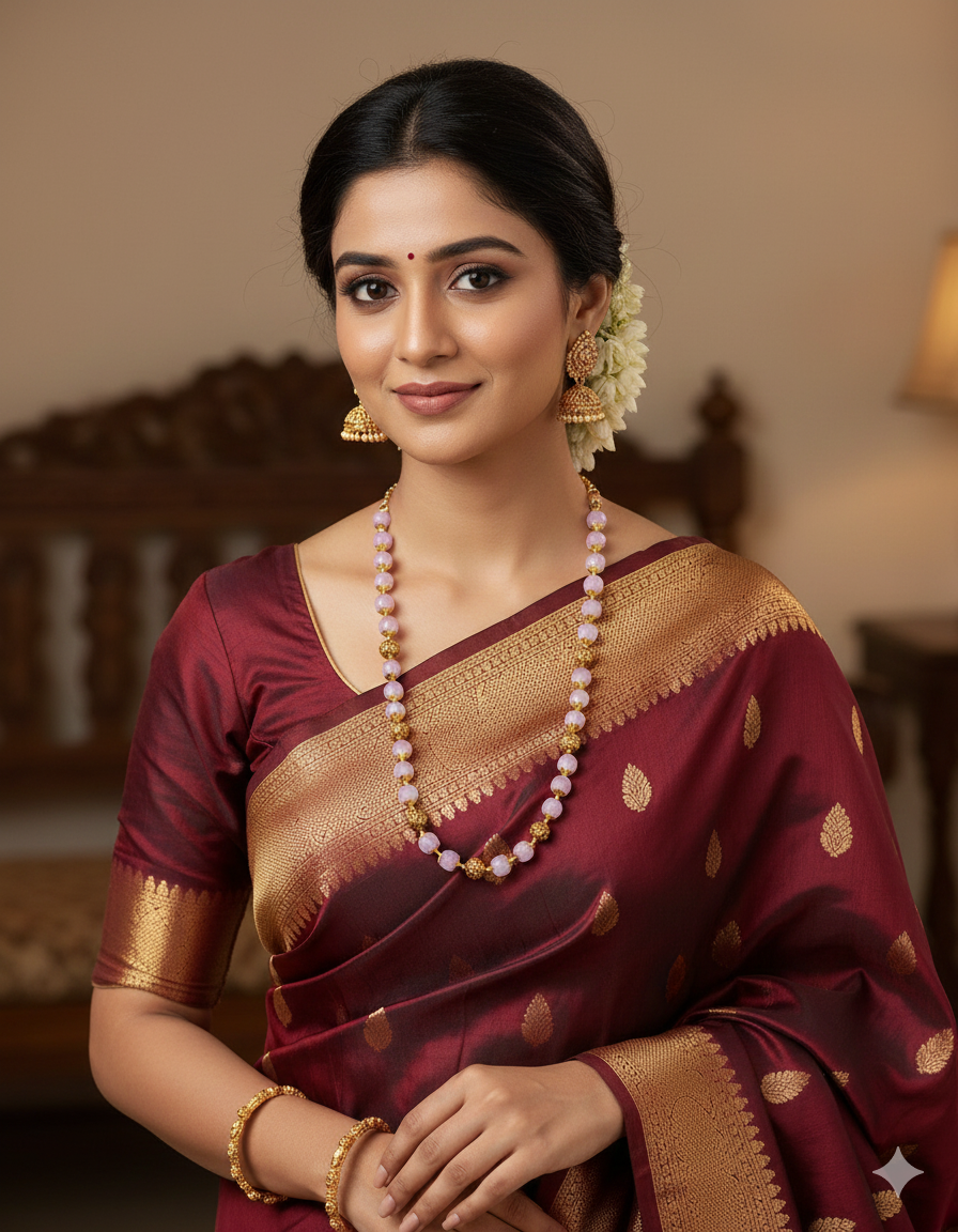 Make a bold statement with our Amethyst Pumpkin Beads Mala, accented with gold beads and fine metalwork. A vibrant and stylish pick for any traditional occasion!