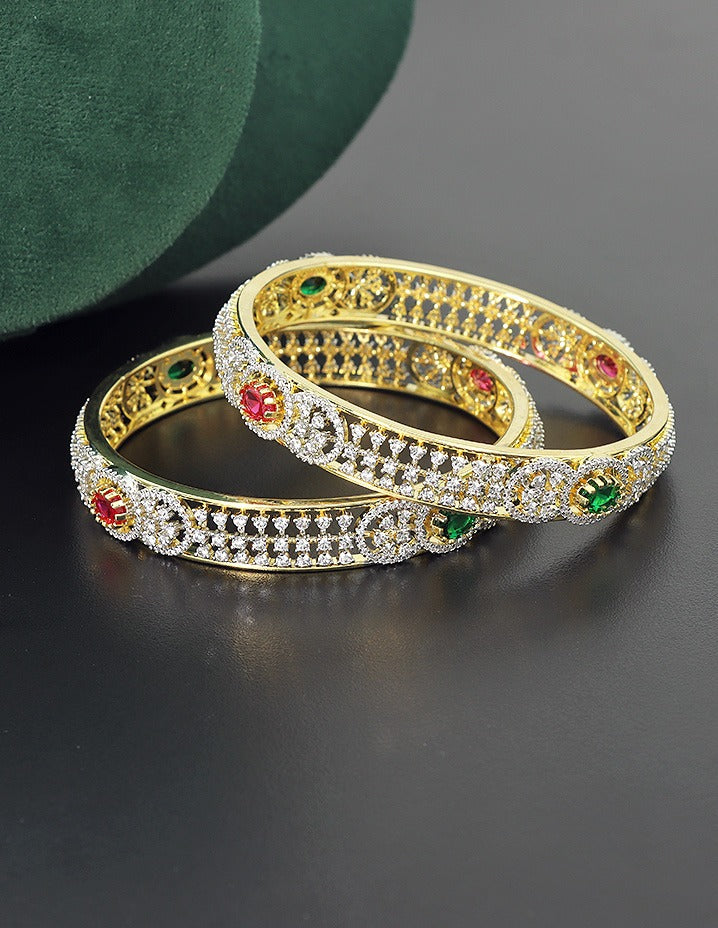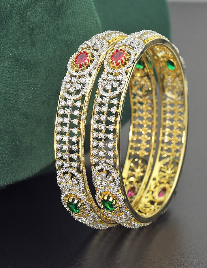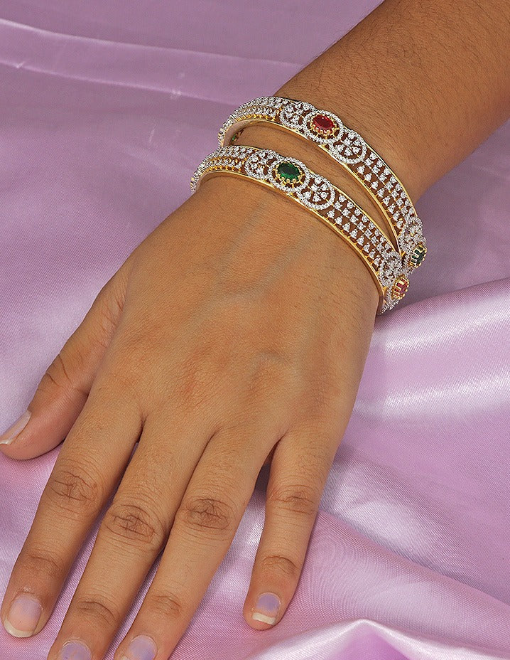 Elevate your look with this Designer Zirconia Bangle. Available in various sizes, this bangle features zirconia stones in Ruby, Emerald, and White. A must-have for any jewelry collection.