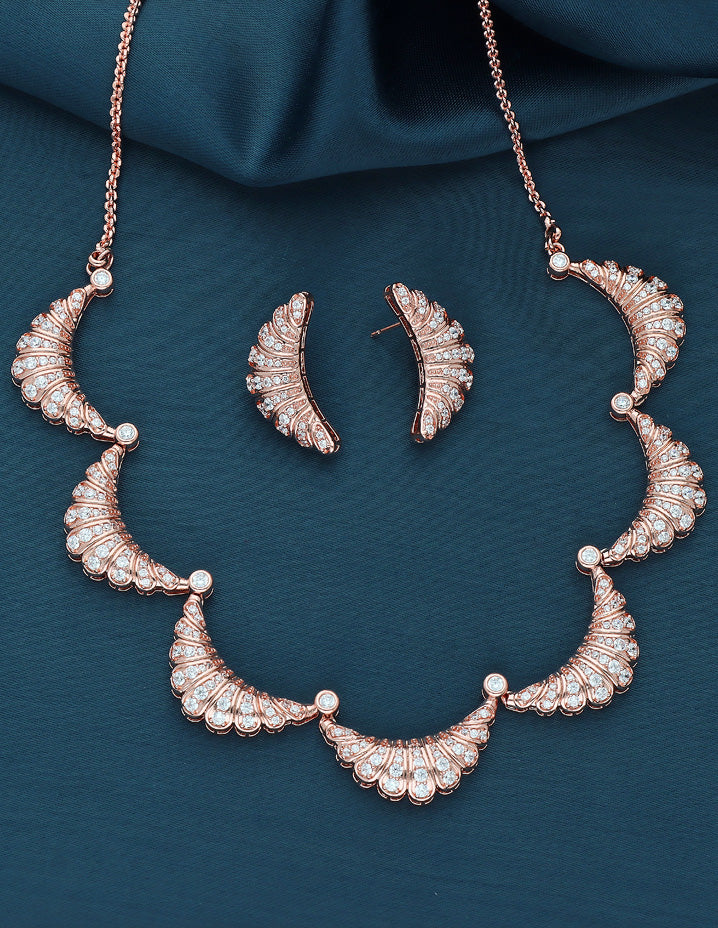 This beautiful Rose Gold polish CZ necklace set right here is dripping in elegance and style. The eccentric design of the necklace, studded in American diamond stones looks like a treat to the eyes.