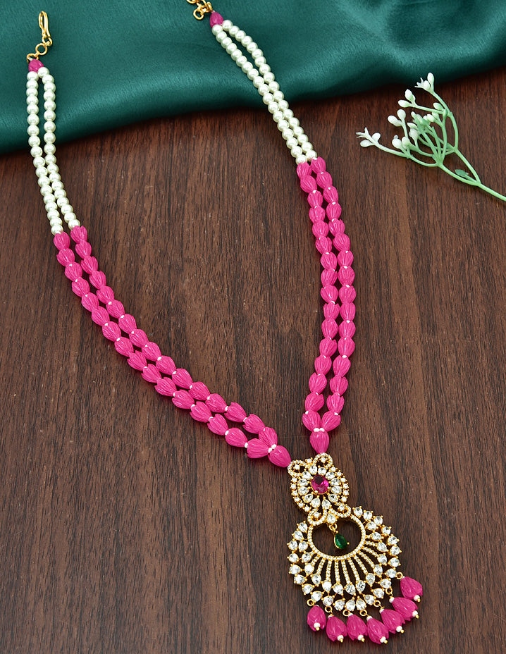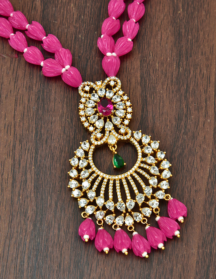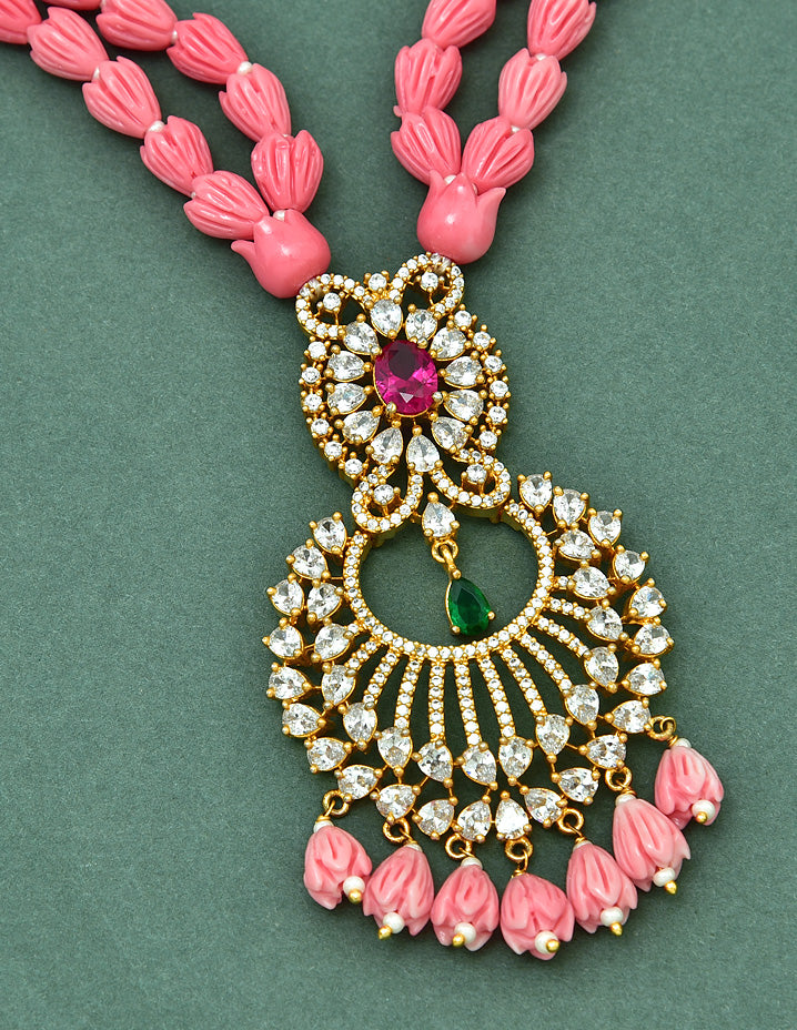 Add a touch of luxury with this Tulip-Inspired Designer Pendant, crafted in gold polish and studded with ruby, emerald & white zirconia stones. A perfect blend of tradition and trend for any elegant occasion!