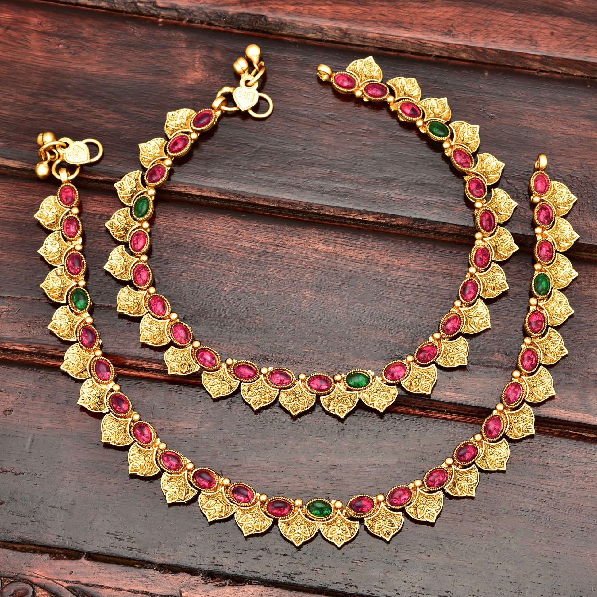 Traditional matte Kemp anklets adorned with ruby and emerald stones for a timeless, elegant look. Perfect for everyday sarees or special occasions—perfect jewelry for the perfect you!