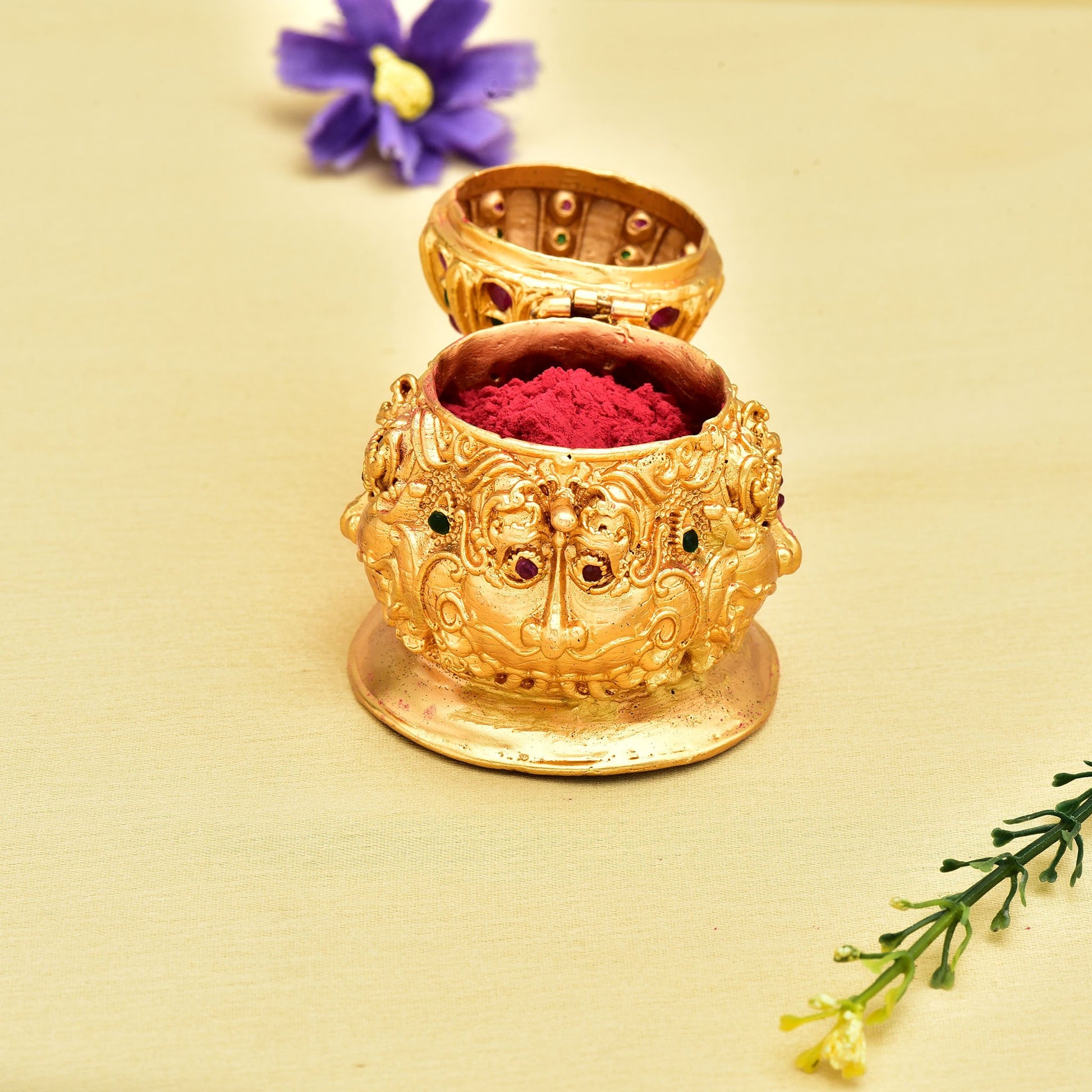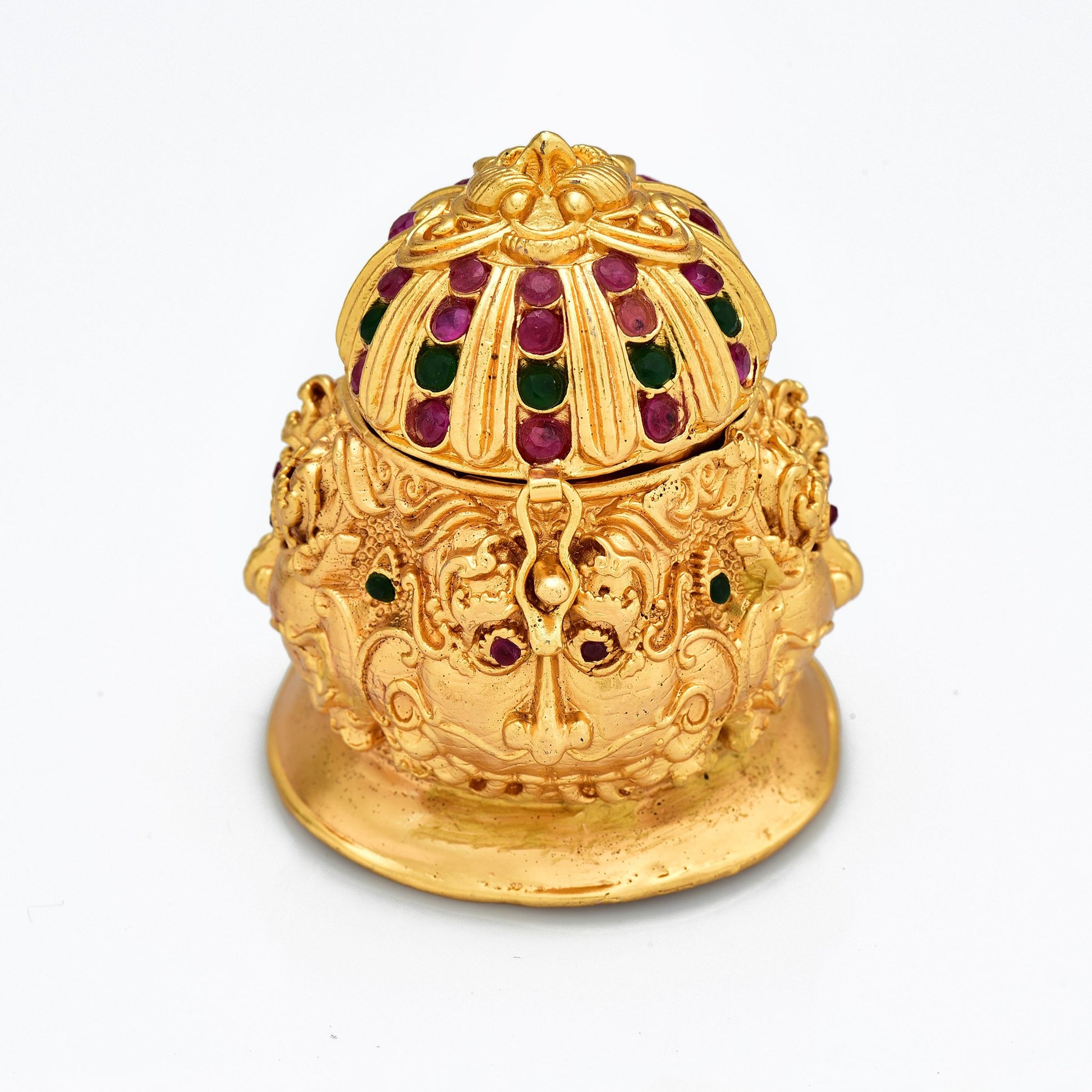 This traditional Ruby & Emerald American Diamond Matt Gold Plated Sindhoor Dabbi is made of the highest quality metalwork and studded with an elegant Kempu Stones. Its perfect for pooja and auspicious occasions.