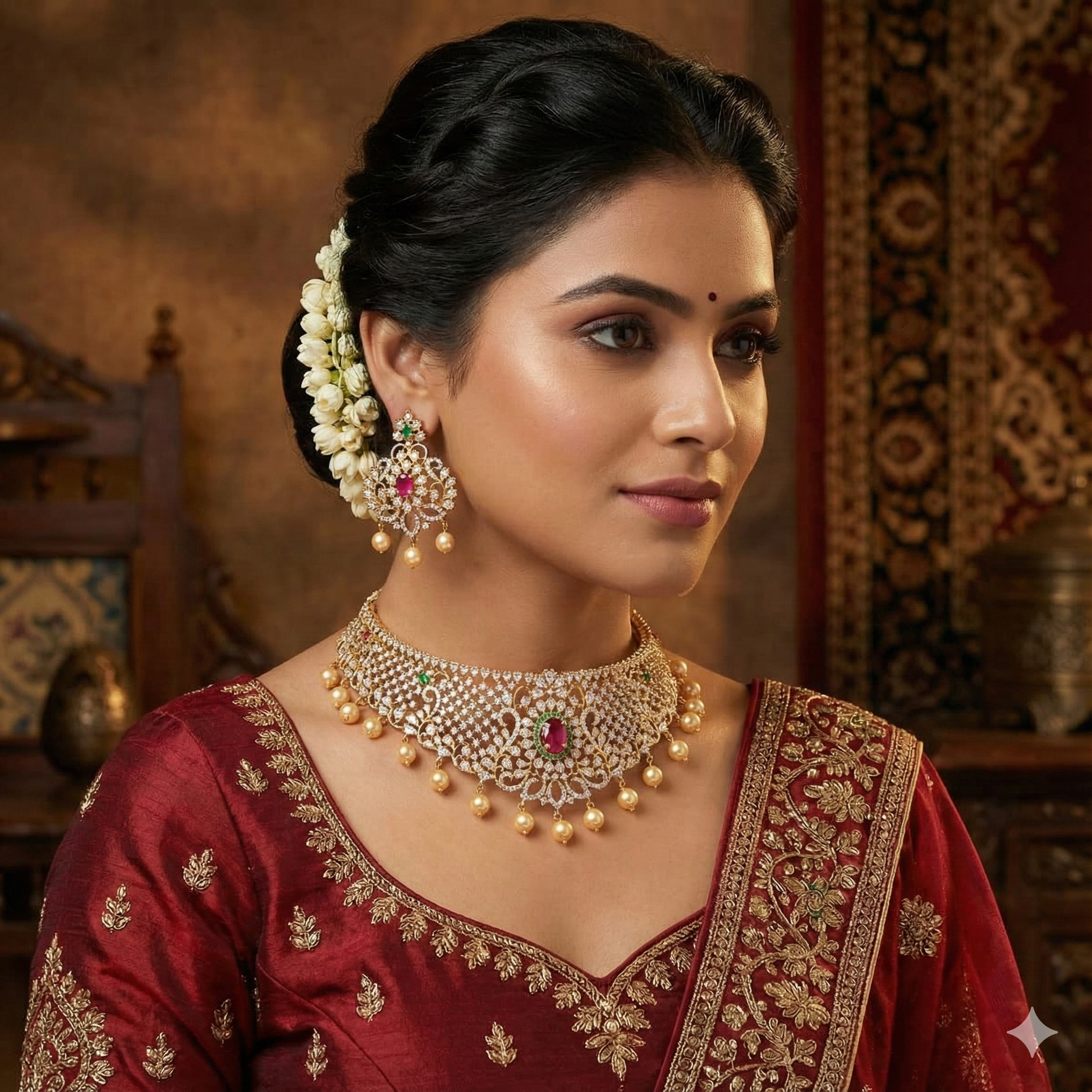 This smart and attractive choker set is the perfect addition to any jewelry collection. Embedded with white American diamonds, Rani pink, and emeralds, its striking design makes it truly one of a kind. Pair it with matching earrings for a festive occasion and you’re sure to steal the show!