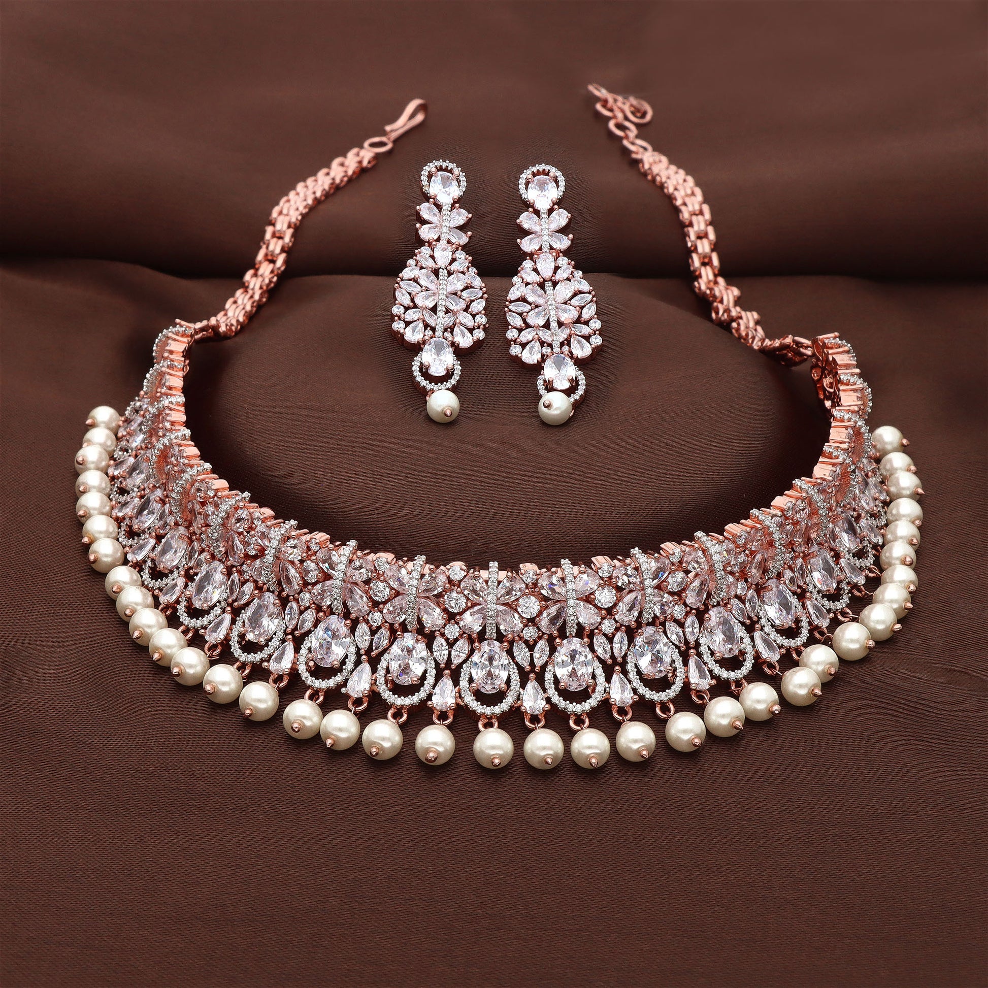 Make a royal statement with this exquisite choker set, studded with baby pink American diamonds and finished in elegant rose gold. Perfect for weddings, it pairs beautifully with sarees or lehengas to give you that unforgettable bridal glow!