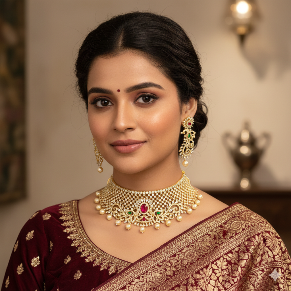 This stunning gold-plated choker features rani pink, emerald, and white stones, accented with dazzling American Diamonds. Perfect for any traditional occasion, it’s sure to add a bold and elegant touch to your look!