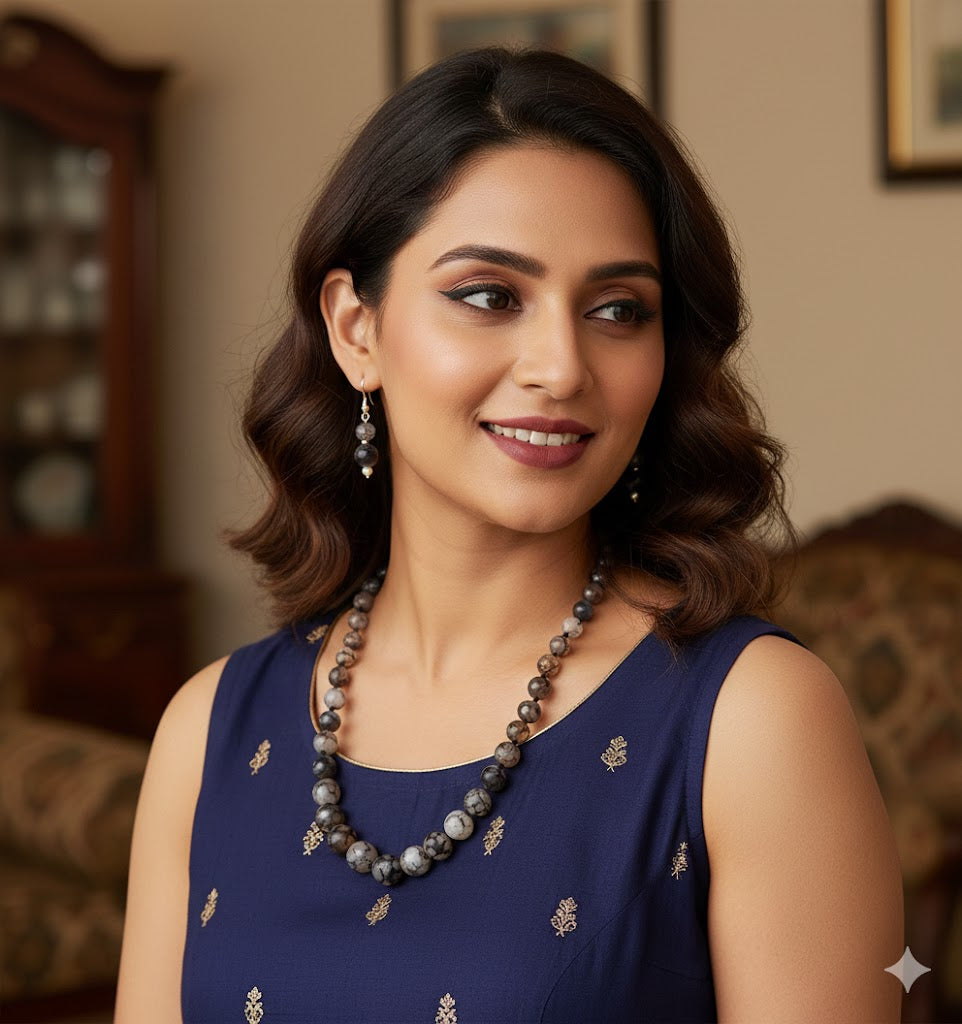Elevate your look with our Ash & White Cut Beads Mala Set, perfect for tradition or party vibes. Paired with matching earrings for a complete, classy touch!