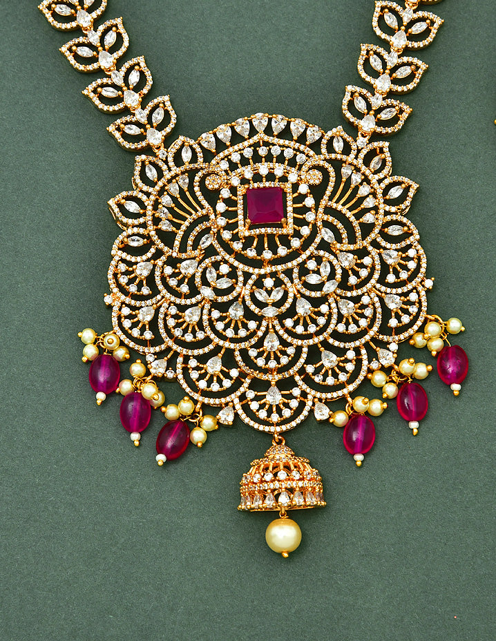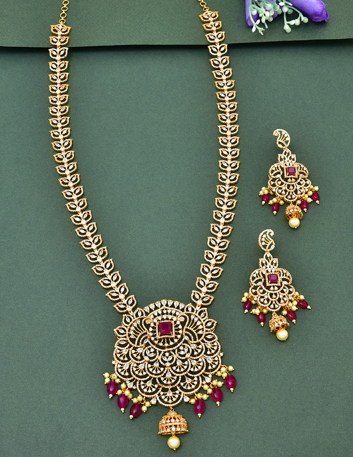 Pair your regal silk saree with this majestic Zircon Long Haram Set, featuring a flawless design of Ruby & White American Diamonds. The carat finish enhances the beauty, making it the perfect statement piece for any traditional occasion.