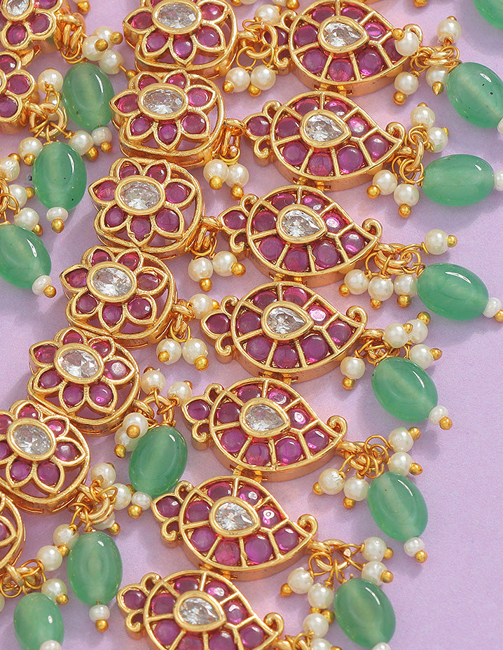 This Designer Kempu Grand Wedding 3 Layered Haaram Set features intricately crafted matt polish green beads, enhancing its traditional elegance. Perfect for grand occasions, it offers a regal statement with its rich design and layered charm.