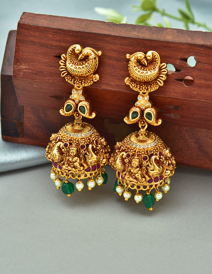 This Antique Gold Plated Kempu Long Haram Set, adorned with ruby & emerald stones, is a celebration of timeless tradition. Paired with matching earrings, it’s the perfect pick to elevate your ethnic style with regal elegance.