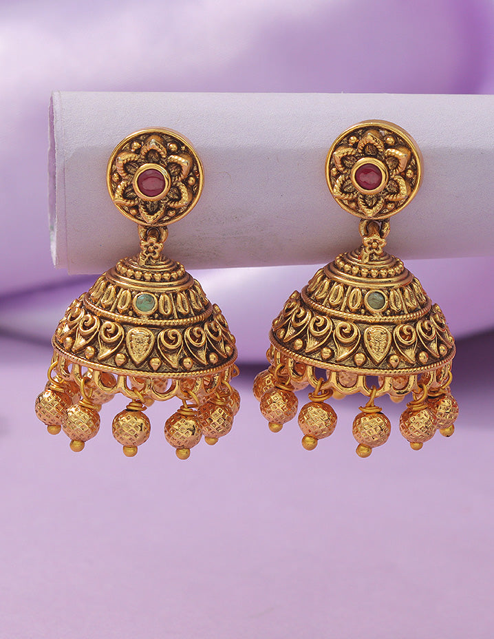 Inspired by temple art, this majestic gold-toned Long Haaram features intricate motifs and a central goddess pendant, complemented by matching jhumkas. A stunning statement piece for weddings and traditional celebrations.