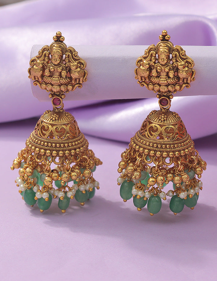 Inspired by temple art, this majestic gold-toned Long Haaram features intricate motifs and a central goddess pendant, complemented by matching jhumkas. A stunning statement piece for weddings and traditional celebrations.