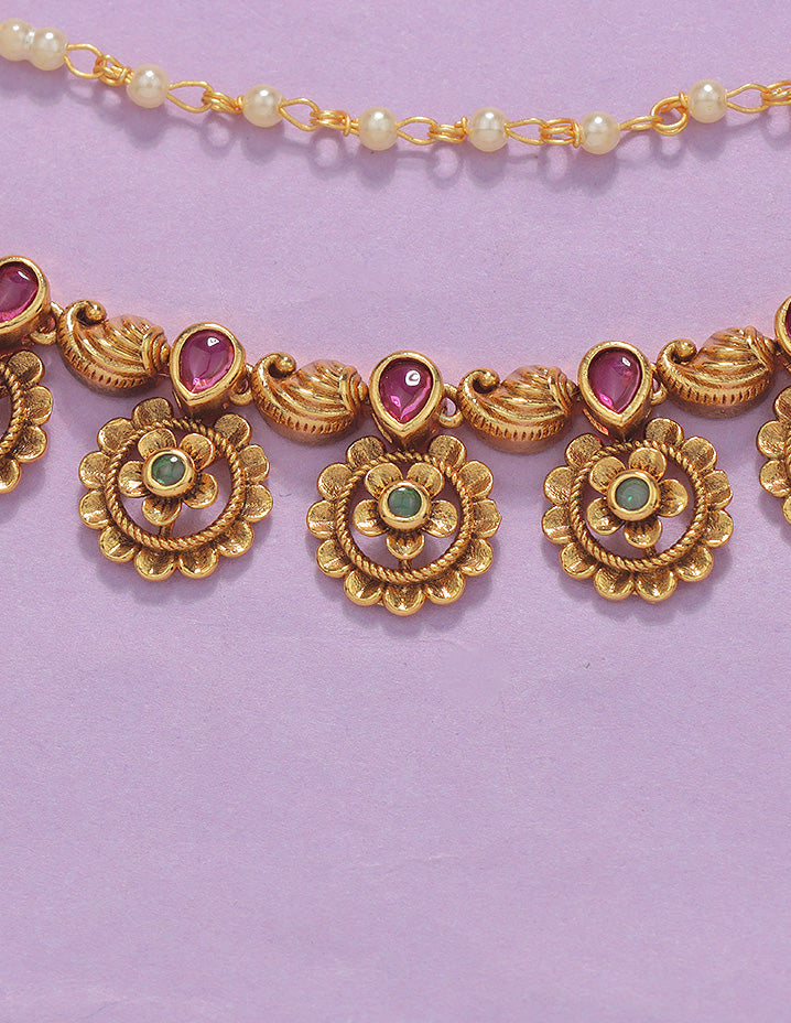 This Designer Matt Kempu Stone Chempaswaralu, adorned with ruby and emerald accents, offers a unique blend of traditional elegance and vibrant color. Its expert craftsmanship ensures a distinctive statement piece perfect for discerning customers.