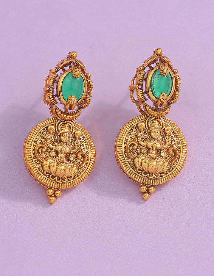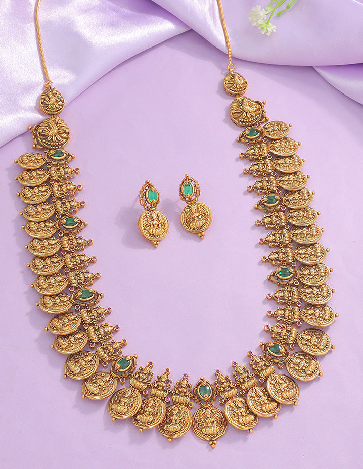 The Designer Matt Lakshmi Devi Kasula Kempu Long Haaram caters to customers who appreciate traditional South Indian jewelry with intricate temple-inspired designs. It attracts those seeking timeless elegance and cultural depth in their statement pieces.