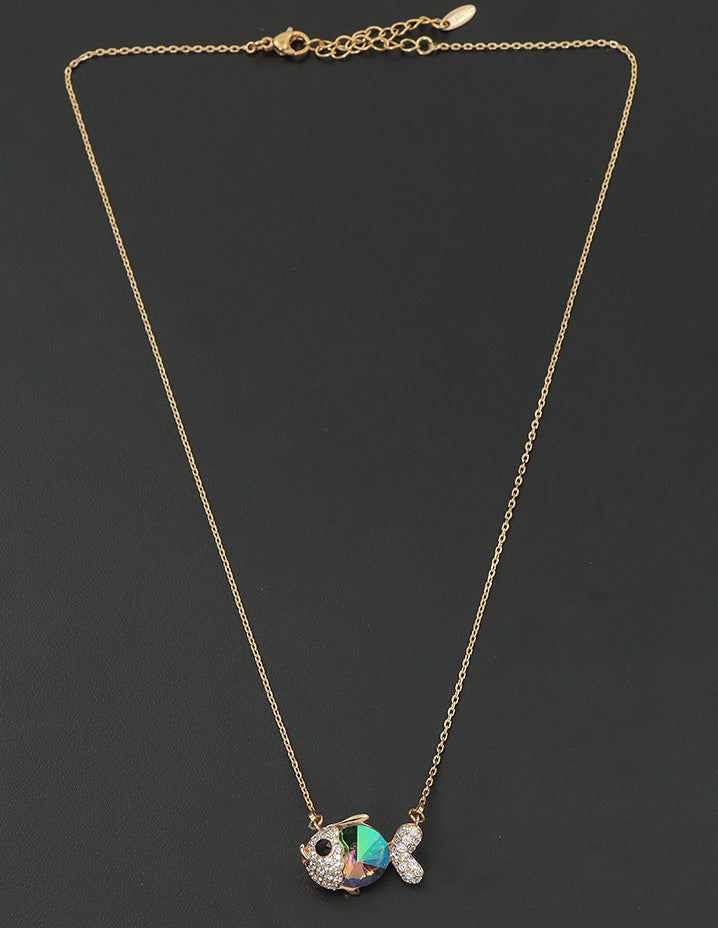 A cute and whimsical fish pendant with dazzling crystals and a golden finish — perfect to add charm and fun to any look!🐟✨
