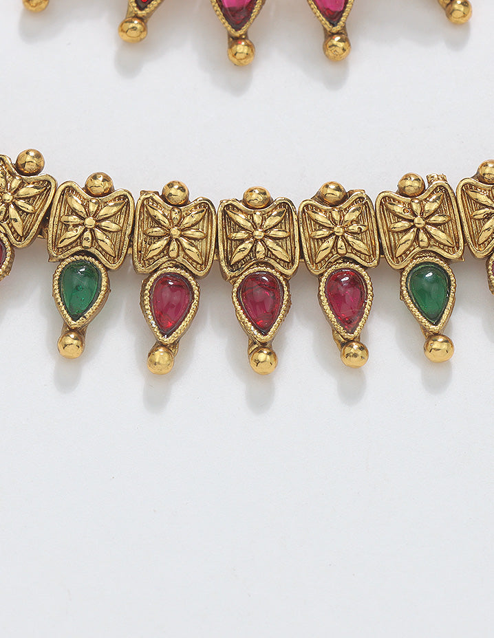 Step into elegance with this beautifully layered anklet set, adorned with intricate bud-shaped motifs and traditional detailing. The antique gold finish adds a royal charm, making it a stunning choice for weddings, festivals, and classical dance ensembles.