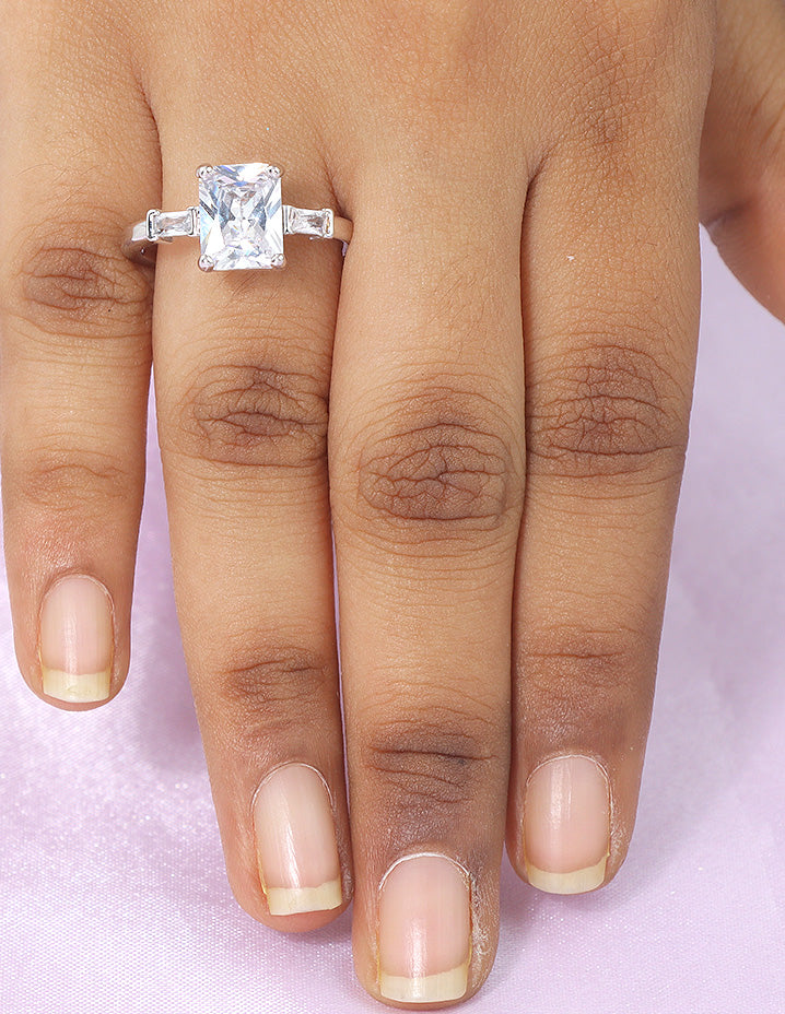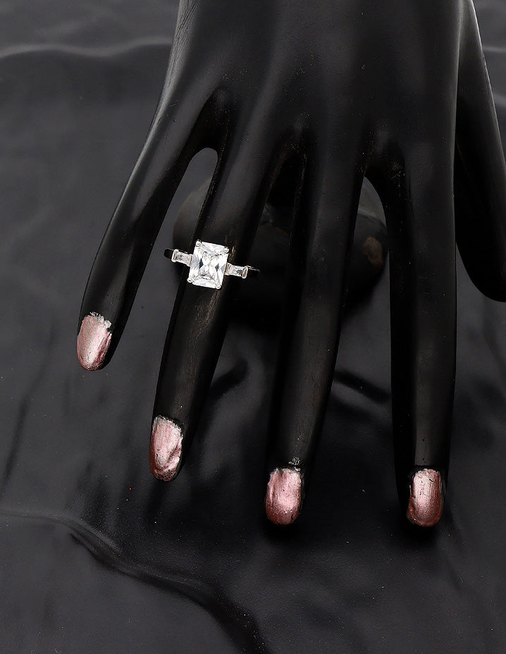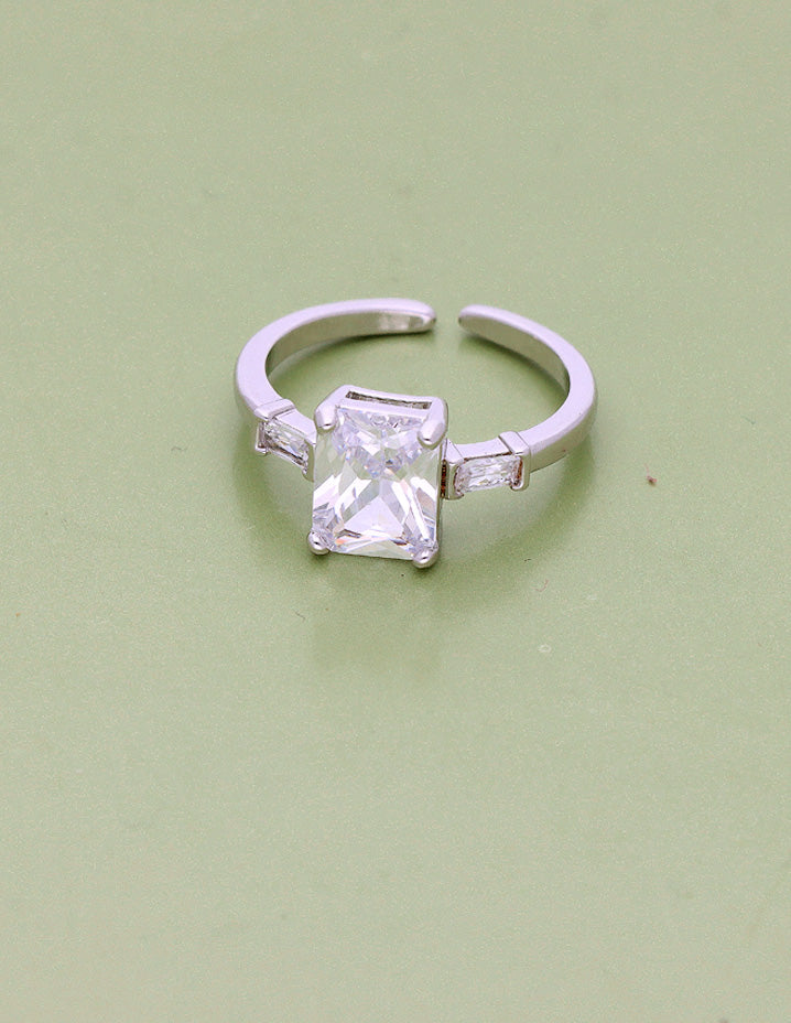 Designer ring is a beautiful silver-toned adjustable ring featuring a radiant-cut central clear gemstone flanked by two smaller baguette-cut stones on either side.