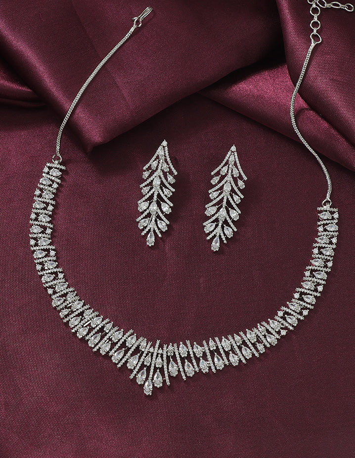 A radiant Rhodium-toned necklace and earring set adorned with sparkling Bud and floral motifs, perfectly blending elegance and charm for your special occasions.