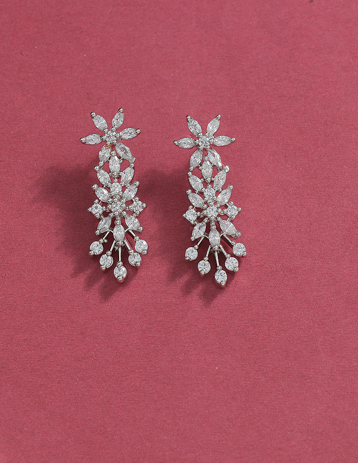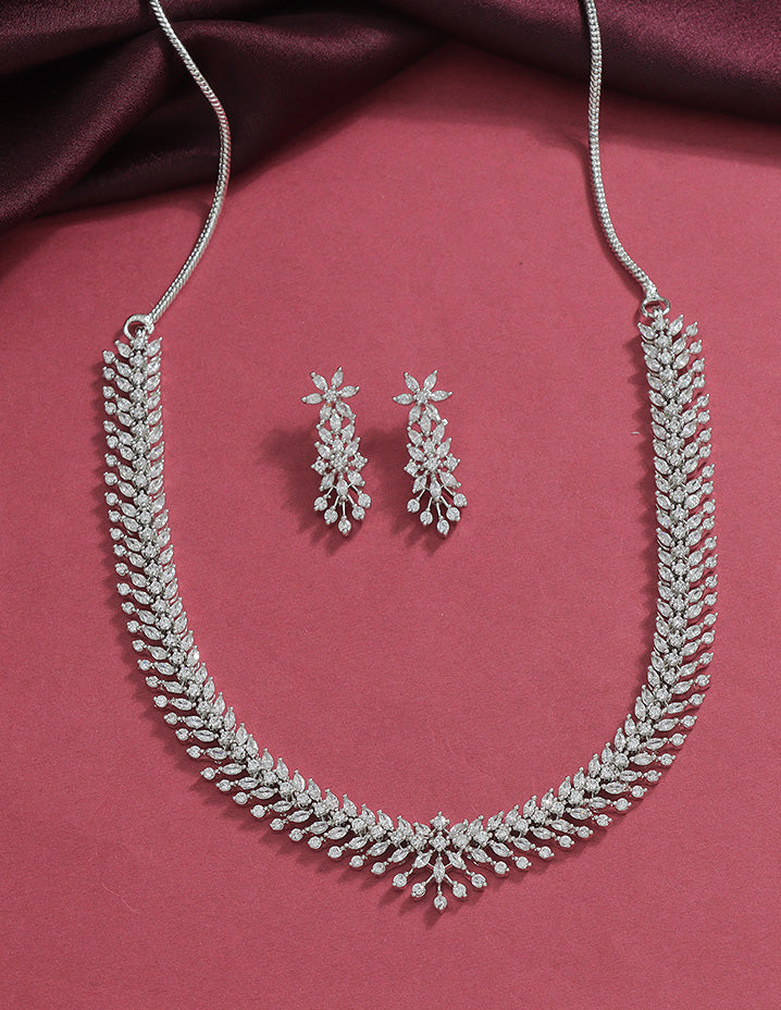 A radiant Rhodium-toned necklace and earring set adorned with sparkling Bud and floral motifs, perfectly blending elegance and charm for your special occasions.