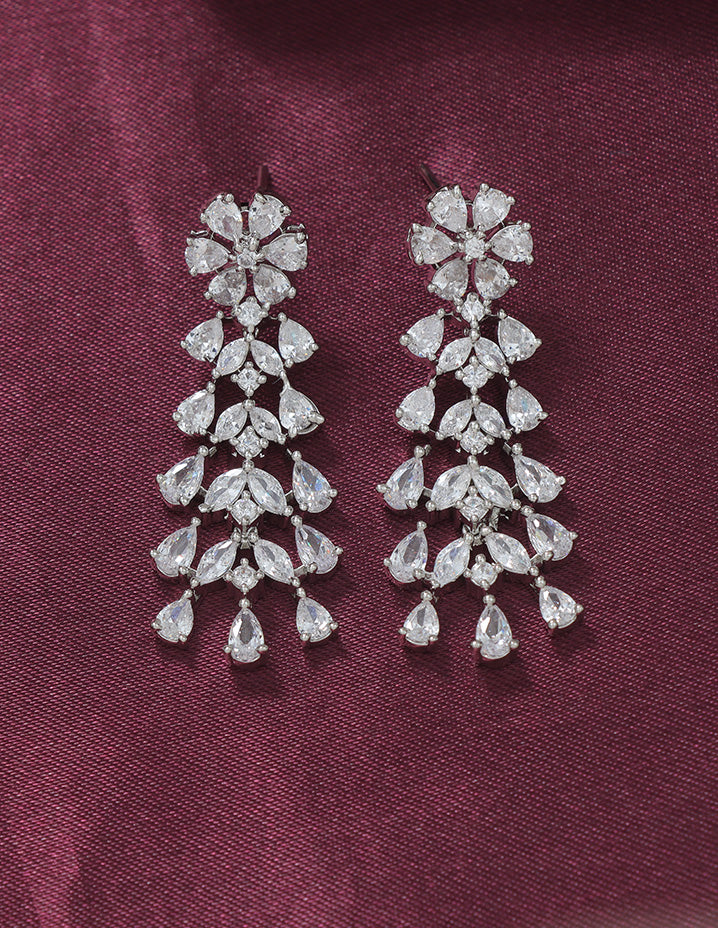 This Designer Zirconia Elegance Necklace Set features sparkling white stones enhanced by a durable rhodium polish. Its refined craftsmanship adds a sophisticated glow to any ensemble.