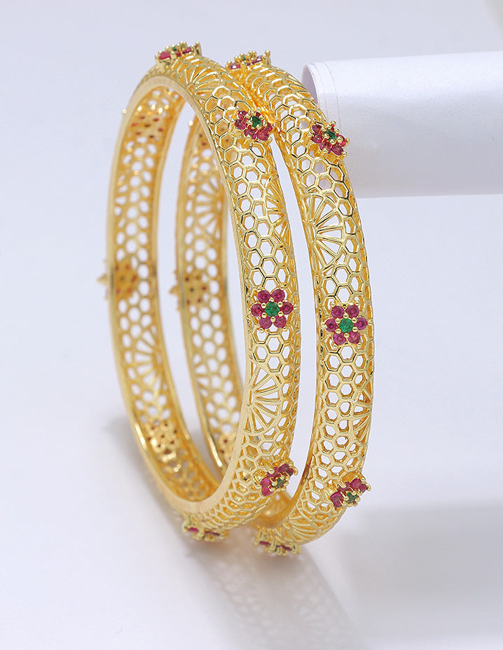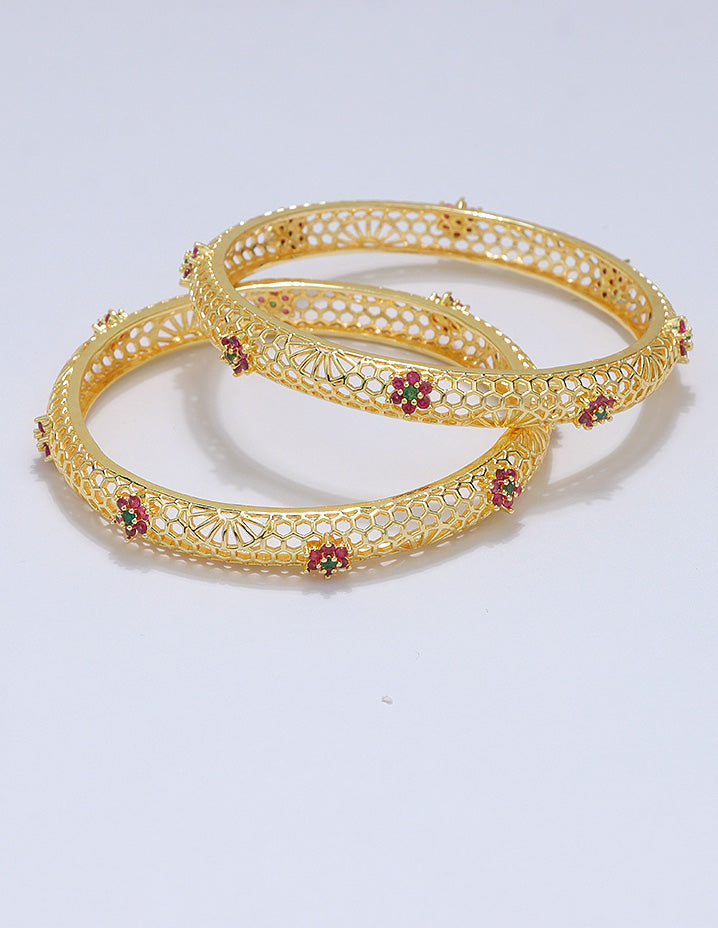Make a timeless statement with our Zircon Gold Polish Bangles, featuring delicate floral CZ design. Elegant solo or stacked!