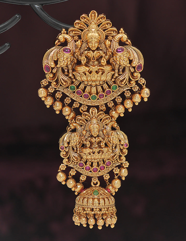 This Designer Zirconia Lakshmi Devi Choti Piece features sparkling zirconia stones with ruby and emerald accents. Its elegant design symbolizes prosperity and grace, making it a perfect choice for traditional or festive occasions. Lightweight and stylish, it adds a refined touch to your hairstyle effortlessly.