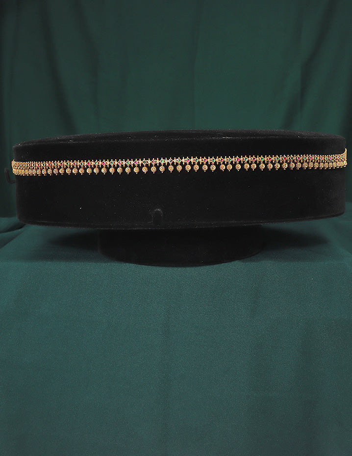 This Designer Kempu Matt Chain Vaddanam features a finely crafted matt finish that adds a subtle sophistication to traditional attire. Adorned with ruby and emerald stones arranged in two elegant lines, it brings a rich blend of color and charm, perfect for accentuating festive and ceremonial looks with expert craftsmanship.